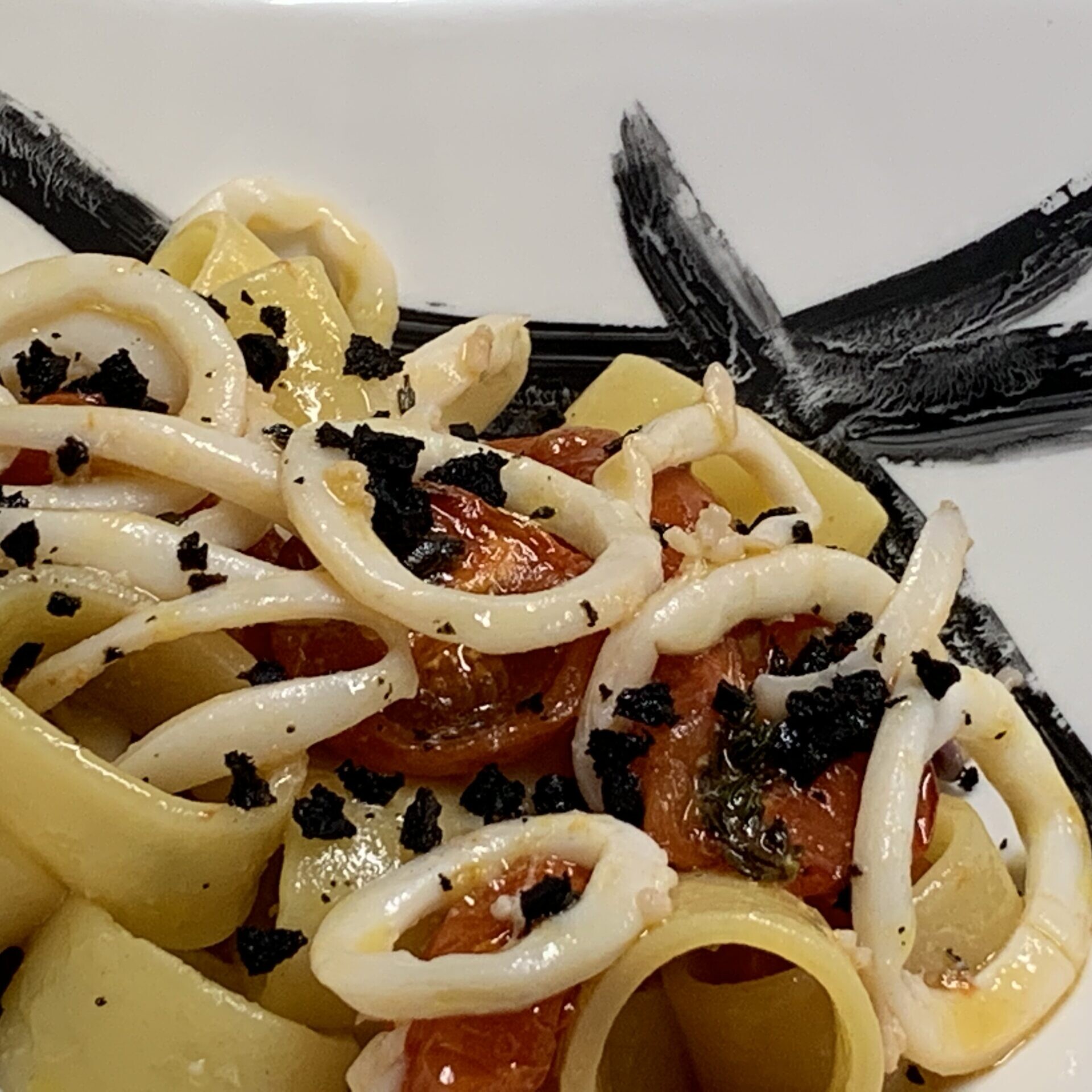 - Maltagliati con pachino confit e gamberoni